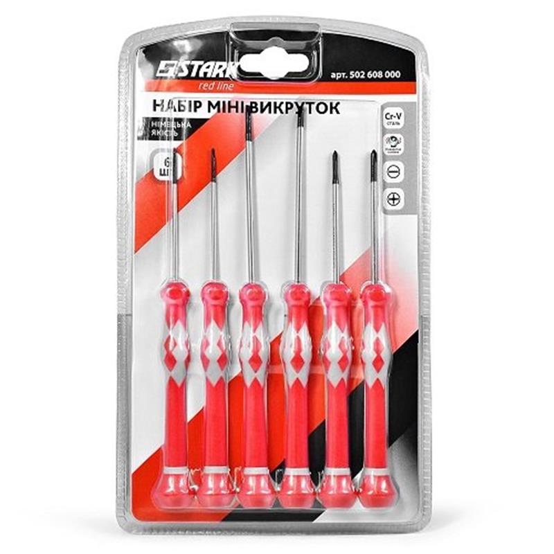 Stark 6 шт. – набір викруток для роботи з закручування дрібних кріпильних елементів, для роботи з електронікою. Виготовлені із хром-ванадієвої сталі, яка забезпечує зносостійкість інструменту. Має твердість, що запобігає стирання жала, а також захищені від корозії. Рукоятки та жало не проводять статичної електрики, не намагнічуються, що дозволяє працювати інструментом з електроприладами та іншою електронікою. Набір викруток Stark складається з 6 предметів: Викрутка SL 2x60 мм (0,3 х1, 8) - довжина жала - 60 мм; діаметр жала – 2, розмір робочої частини – 0,3х1,8 мм. Викрутка SL 2x60 мм (0,4 х2, 0) - довжина жала - 60 мм; діаметр жала – 2, розмір робочої частини – 0,4х2,0 мм. Викрутка SL 3x80 мм (0,5 х3, 0) - Довжина жала - 80 мм; діаметр жала – 3, розмір робочої частини – 0,5х3,0 мм. Викрутка SL 3x80 мм (0,4 х2, 5) - довжина жала - 80 мм; діаметр жала – 3, розмір робочої частини – 0,4х2,5 мм. Викрутка PH0 х 60 мм (3 мм) - Довжина жала - 60 мм, діаметр жала - 3 мм, підходить для роботи з шурупами менше 2 мм; Викрутка PH00 х 60 мм (3 мм) – довжина жала – 60 мм, діаметр жала – 3 мм, використовується з дуже маленькими шурупами. Stark 6 шт. – набір компактних викруток для розбирання та збирання предметів з дрібними шурупами, під які звичайні викрутки не підходять.