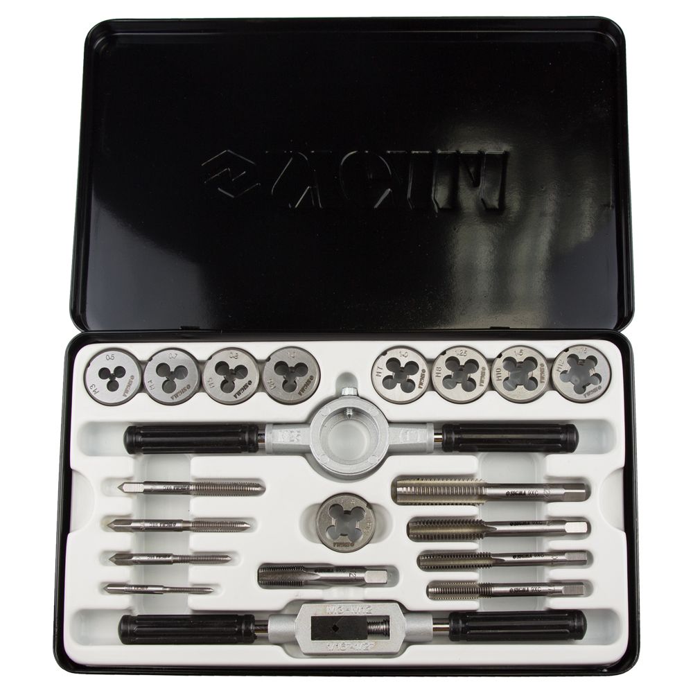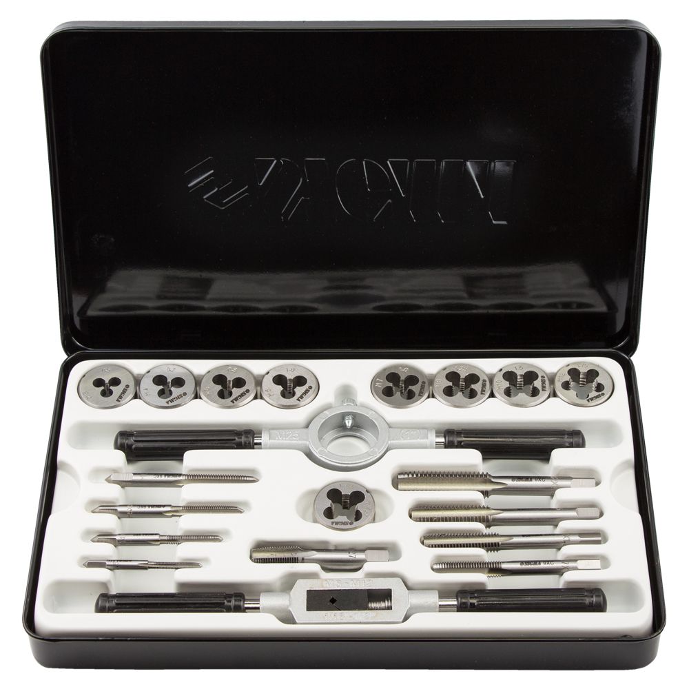 Набір плашок та мітчиків 20 предметів (металевий кейс) Sigma (1643111) призначений для нарізування внутрішнього та зовнішнього метричного різьблення на металевих виробах, для калібрування та відновлення пошкоджених ділянок різьблення. При нарізанні, різьблення, попередньо змащують консистентним мастилом.