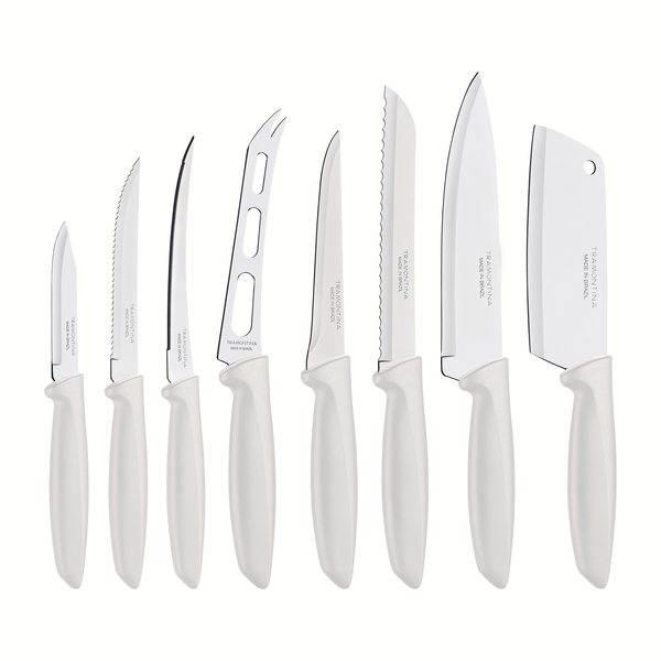 Набор ножей Tramontina Plenus light grey, 8 предметов (23498/332) Комплектация: Нож топорик (тесак) 1 шт - 127 мм Нож поварской "ШЕФ" 1 шт - 178 мм Нож для хлеба 1 шт - 178 мм Нож для сыра 1 шт - 152 мм Нож обвалочный 1 шт. - 127 мм Нож для томатов 1 шт - 127мм Нож для стейка 1 шт - 127 мм Нож для овощей 1 шт - 76 мм Материал лезвия: нержавеющая сталь AISI 420. Материал рукоятки: полипропилен. Режущая кромка ножа: гладкая\зубчатая. Упаковка: индивидуальный блистер.