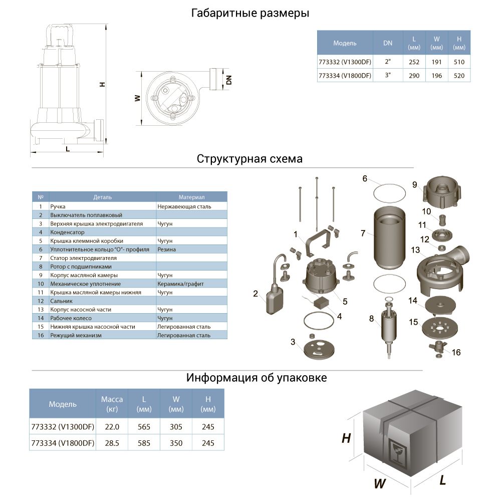 - Корпус насоса: чавун/нержавіюча сталь AISI 304;