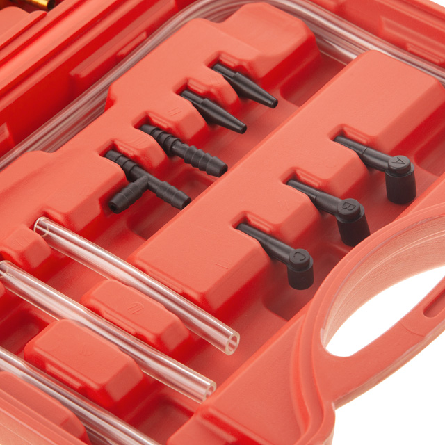 В комплект входять всі необхідні елементи для зручної роботи: шланги та перехідники для підключення до різних систем, ємність для рідини та компактний кейс для зберігання та транспортування. Надійний, компактний та зручний у використанні, цей насос стане практичним та безпечним інструментом для обслуговування автомобіля.
