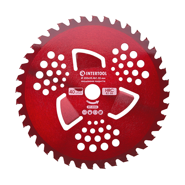 Ніж для мотокоси/тримера з твердосплавними напайками ø255x25.4x1.35 мм 40T, HRC 82-86, 3 підрізні лопаті, анодоване покриття