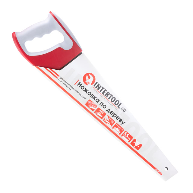 Ножівка по дереву виготовлена із міцної, загартованої сталі, твердістю 55 HRC. Щільне потовщене полотно забезпечує підвищену точність пиляння. Довжина робочої поверхні — 450 мм. Гартовані зубці в кількості 11 зубців x 1 дюйм, мають потрійне заточення та забезпечують швидке різання в обидві сторони - як вперед, так і на себе. Зубці пили загартовані, зберігають гостроту різального краю та не потребують додаткового заточування.