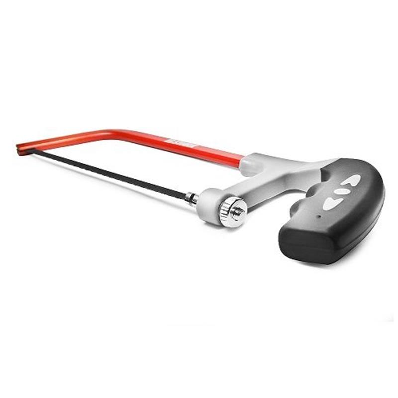 Металевий цілісний корпус лучковою форми забезпечує міцність конструкції і не гнеться в процесі пиляння. Ергономічна рукоятка забезпечує надійне захоплення для гарного упору. Завдяки прогумованої основі і виїмок під пальці рукоятка не ковзає в руці в процесі, що забезпечує безпечну і точну роботу.