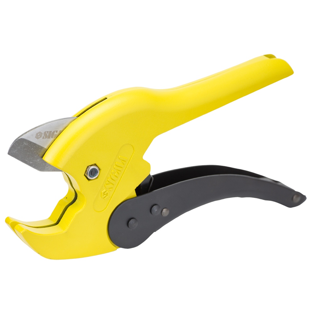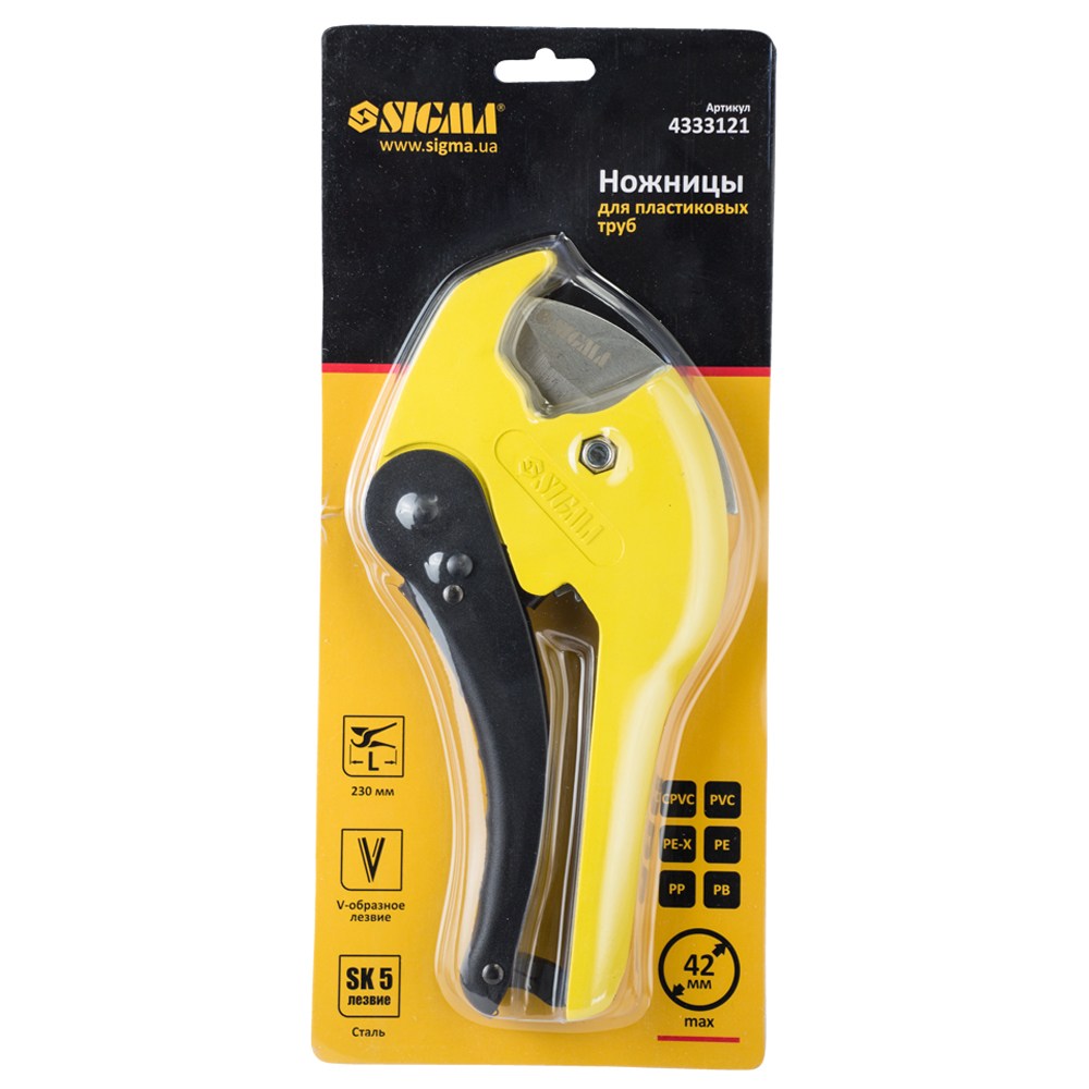 Ножиці для пластикових труб 0-42мм 230мм (сталь SK5) Sigma (4333121) призначені для різання металопластикових труб максимальним діаметром 42 мм при монтажі водопровідних та опалювальних систем. Металеві, пофарбовані. Мають заточені леза з японської інструментальної сталі SK5 та стопорну скобу, що фіксує інструмент у неробочому стані.