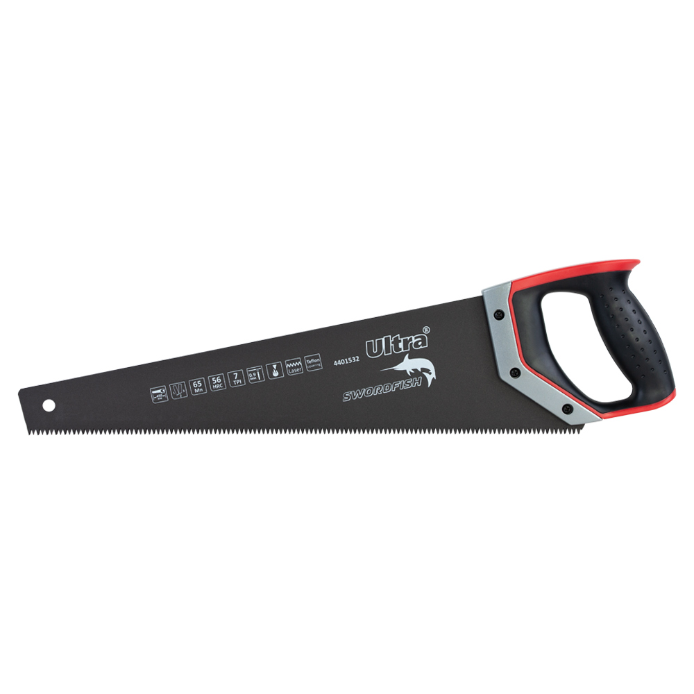 Ножовка по дереву 450мм с тефлоновым покрытием 7TPI Swordfish + чехол Ultra (4401532) изготовлена из высококачественной стали 65Mn. Тефлоновое покрытие защищает от коррозии и уменьшает трение полотна при пилении. Закалка зубьев увеличивает срок службы инструмента и не требует дополнительной заточки. Количество зубьев на дюйм - 7. Резиновый протектор на рукоятке обеспечивает инструменту высокий декремент затухания (поглощение колебаний, возникающих при пилении), а также является отличной защитой рукоятки от механических повреждений.