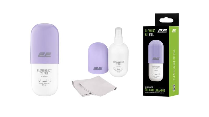 Очисний набір 2E PILL для оргтехніки (рідина 140мл + серветка 20см), біло-бузковий