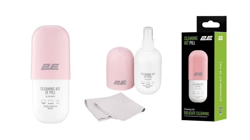 Очисний набір 2E PILL для оргтехніки (рідина 140мл + серветка 20см), біло-рожевий