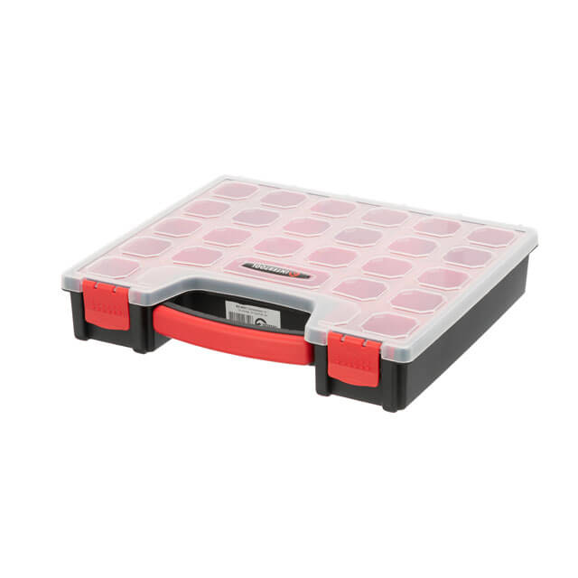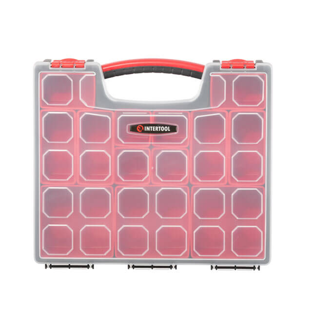 Органайзер виготовлений з міцного, товстого пластику. Два замки надійно притискають кришку та не дають пересипатися навіть невеликим деталям.