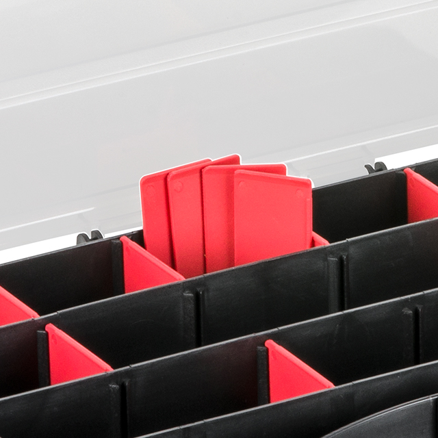 Всередині органайзера передбачено 15 відсіків з перегородками для розміщення кріпильних елементів: металовиробів, фурнітури, запчастин, рибальського приладдя та інших дрібниць. При цьому розмір відділення можна сформувати самостійно, виймаючи необхідну перегородку.
