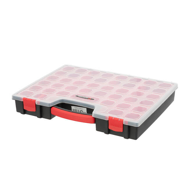Органайзер виготовлений з міцного, товстого пластику. Два замки надійно притискають кришку та не дають пересипатися навіть невеликим деталям.