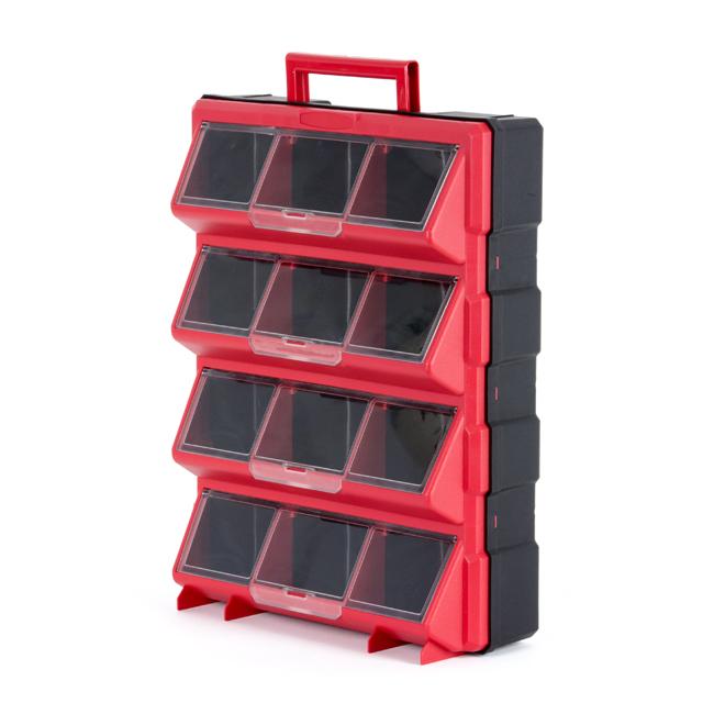 Органайзер з дванадцятьма відділеннями допоможе навести лад на робочому місці, вдома або в гаражі. Добре продумана містка конструкція спрощує зберігання та пошук невеликих речей, наприклад: кріпильних елементів, невеликої фурнітури, металовиробів, біжутерії, бісеру тощо.