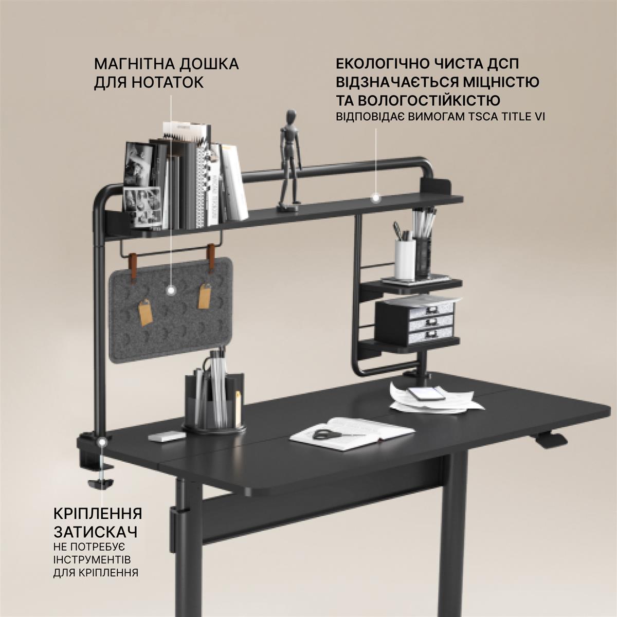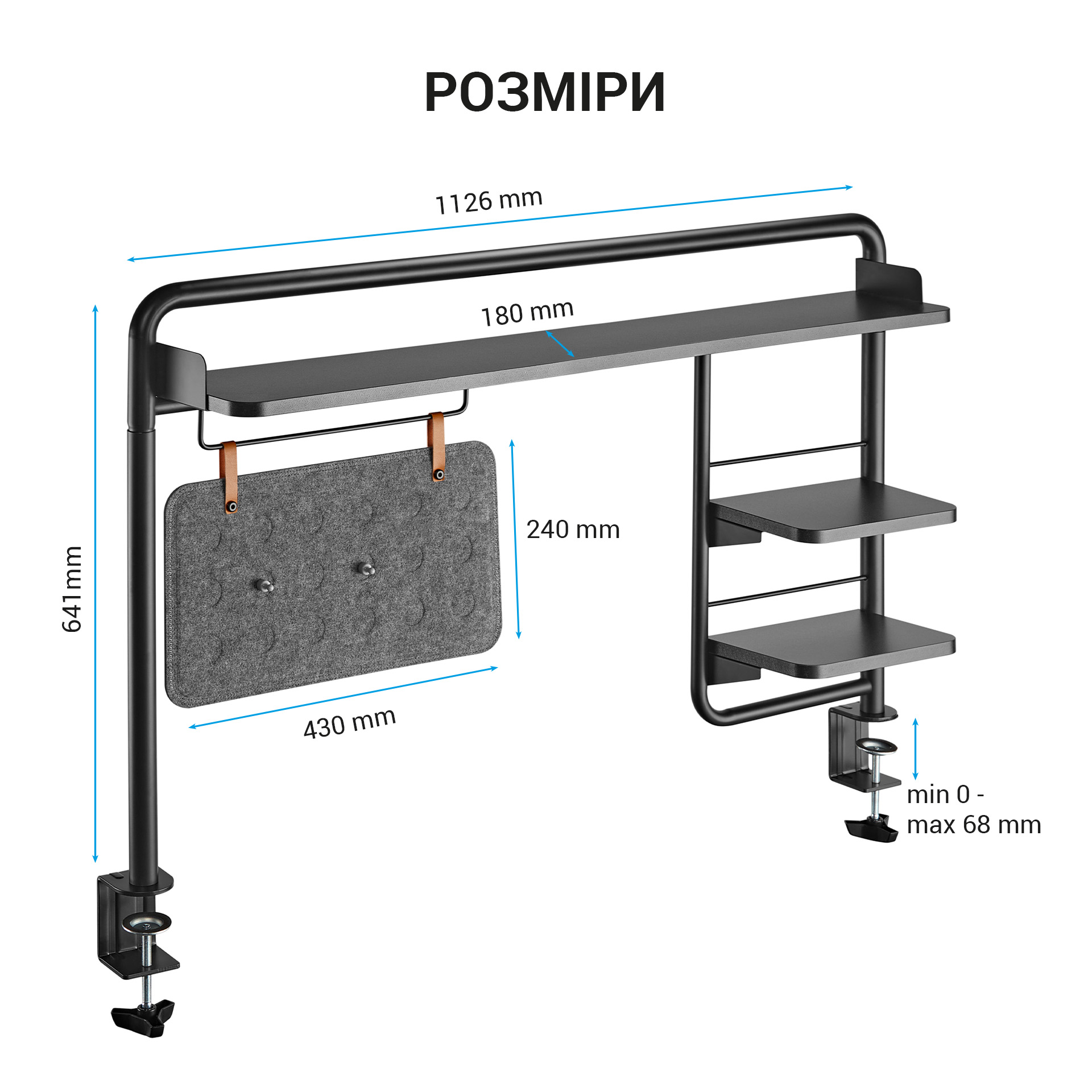 Легкий затискач, що не потребує додаткових інструментів для кріплення, дозволяє прикріпити полицю до робочого столу без свердління отворів.