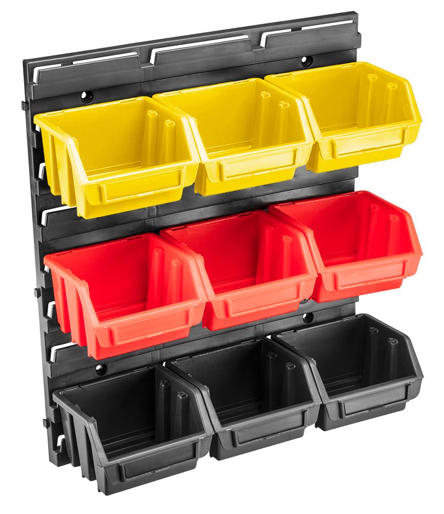 Панель інструментальна з контейнерами розміром 34.5 x 38.5 x 12.5 см. Ця система дозволяє організувати простір майстерні навіть у невеликих приміщеннях. Після монтажу на стіні панель дозволяє розміщати на ній контейнери у різних комбінаціях. До складу набору входить інструментальна панель і 9 магазинних контейнерів розмірами 11.6 x 11.2 x 7.5 см. Додатковою перевагою є використання магазинних контейнерів із поточного асортименту Topex. Марка TOPEX адресована майстрам, які займаються дрібним ремонтом.