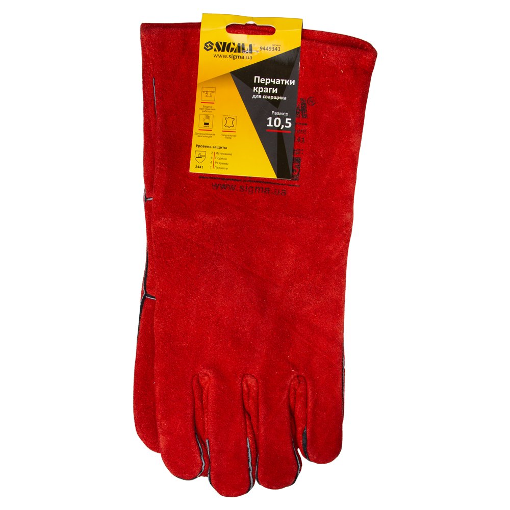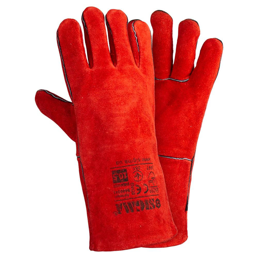 Рукавички краги зварювальника р10,5, клас АВ, довжина 35см (червоні) Sigma (9449341) призначені для захисту рук під час зварювальних робіт, захисту від механічних та термічних впливів.