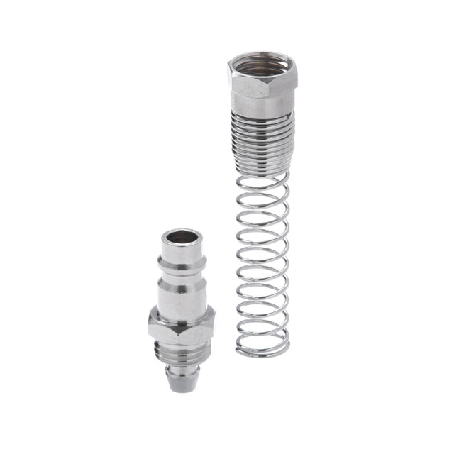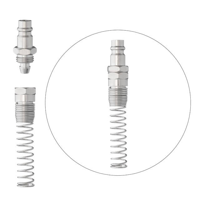 Штирьова частина до швидкороз'ємного з'єднання з пружиною використовується для встановлення на спіральні і прямі повітряні шланги, щоб забезпечити швидке підключення пневмоінструменту до компресора або повітряної магістралі. Також їх використовують для ремонту шлангів з ушкодженнями і для заміни конекторів що вийшли з ладу.