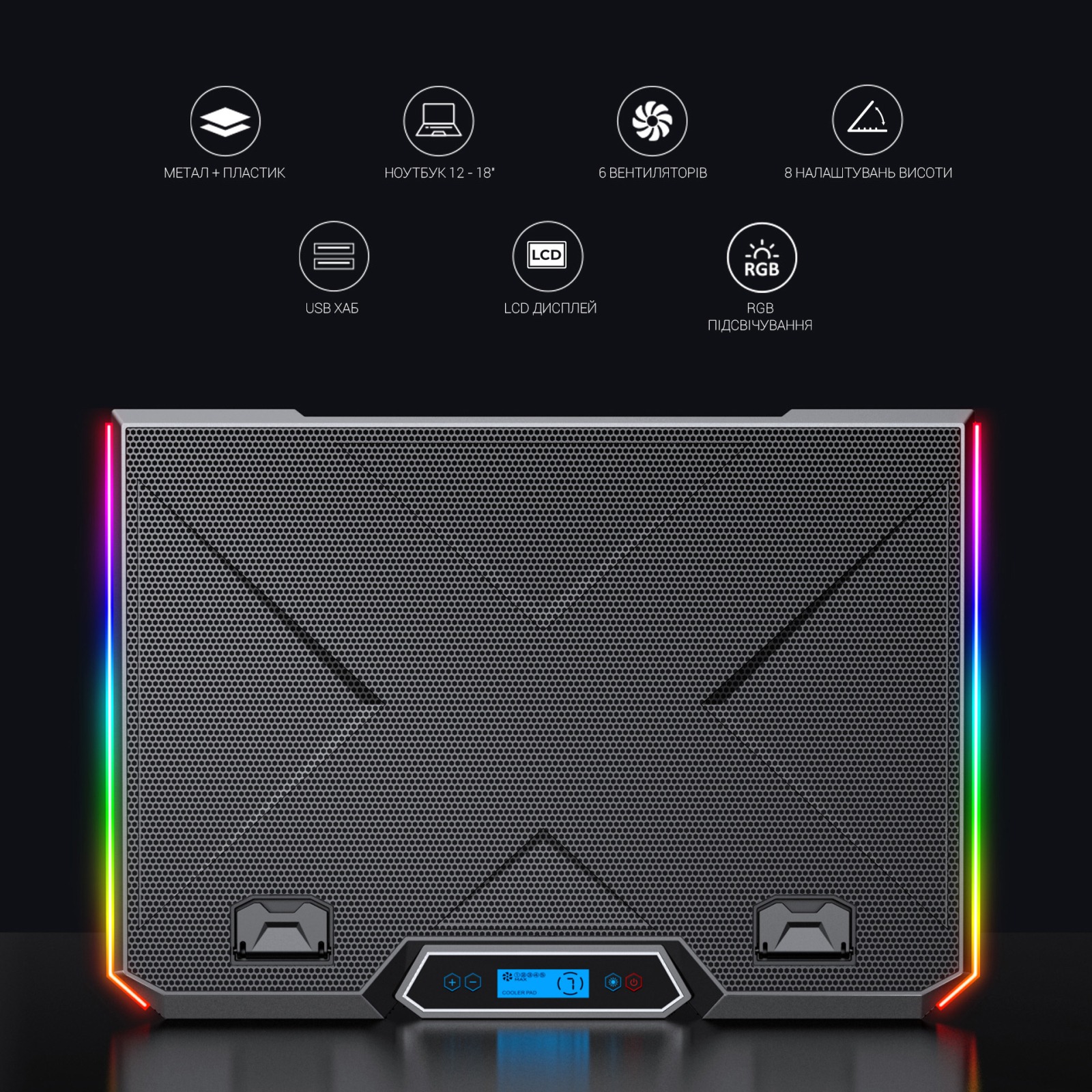 Окрім того, ця підставка вражає своєю гнучкістю. Вона має вісім різних налаштувань висоти, що дозволяє знайти ідеальний кут для комфортної роботи. І ще одна приємна річ - шість рівнів швидкості вентиляторів, які можна легко налаштовувати зручними кнопками.