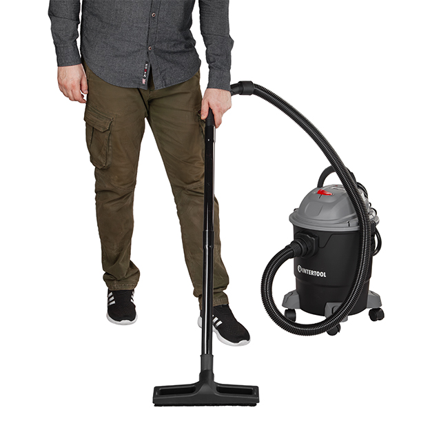 Пилосос працює від звичайної розетки і оснащений двигуном потужністю 1200 Вт. Цього вистачить, щоб без проблем упоратися з будівельним сміттям, адже робоче розрідження становить 17 кПа. Об'єму бака на 20 літрів достатньо, щоб не відволікатися на постійне очищення. Завдяки функції видування, пилосос допоможе швидко очистити робочі поверхні, продути інструмент чи прибрати сміття з важкодоступних кутів.