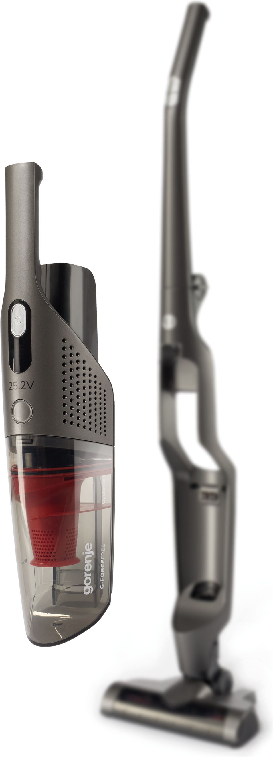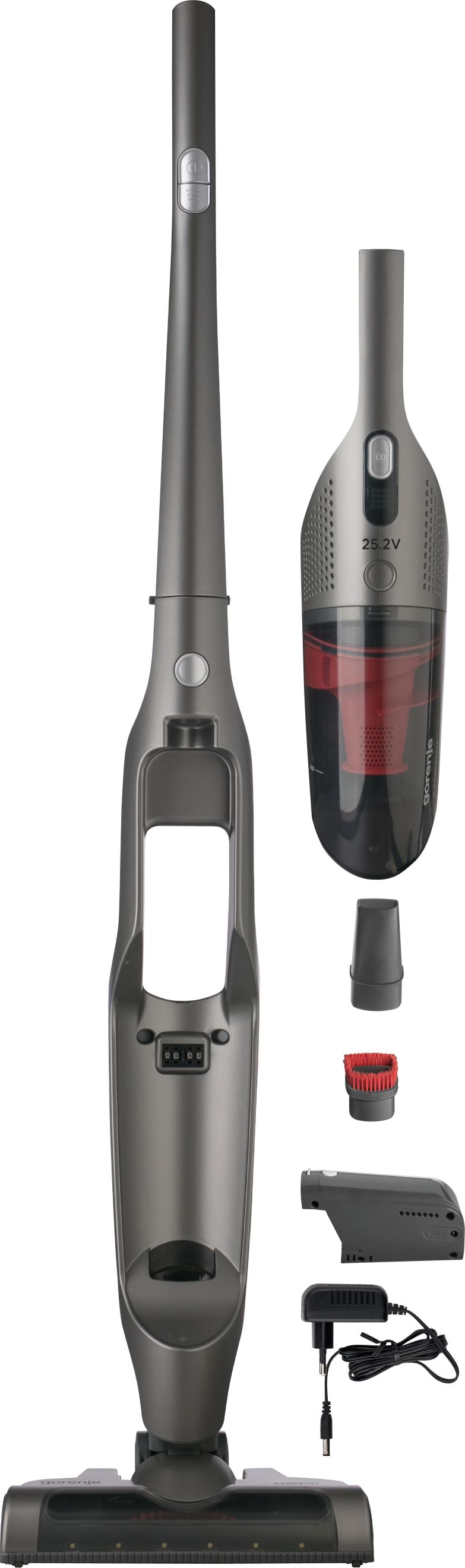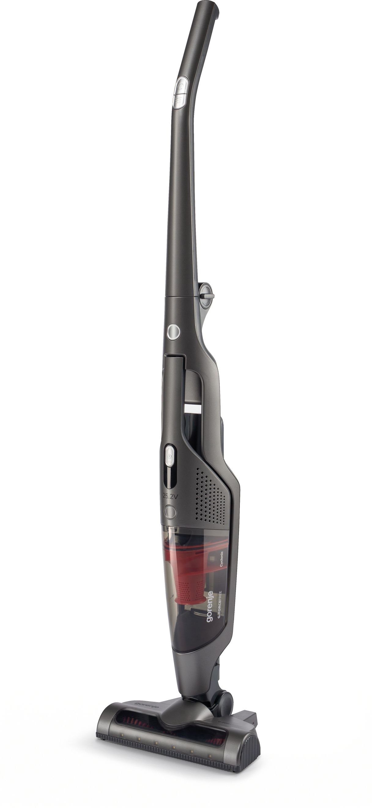Легке очищення контейнера для пилу Не забруднивши рук Контейнер для пилу легко очистити. Одним рухом викрутіть ручку фільтра, витягніть його і витрусіть пил із контейнера. Знімний акумулятор Зберігання й заряджання акумулятора будь-де Не потрібно під"єднувати пилосос до зарядної станції, він стоїть сам по собі. Одним рухом вийміть акумулятор і заряджайте його де зручно. Крім того, якщо придбати додатковий акумулятор, це надасть можливість використовувати пилосос, доки перший акумулятор заряджається. А зручна складна ручка допоможе сховати пилосос у зручне для вас місце для зберігання. Використовуйте лише оригінальні запчастини Gorenje. Постійна потужність Час роботи до 70 хвилин Літієвий акумулятор нового покоління забезпечує значно довший час роботи, ніж у попередніх моделей. Тривалість роботи до 70хвилин дозволяє за один заряд прибирати всю оселю. Час прибирання залежить від налаштування швидкості, типу покриття підлоги та забруднення. Завдяки потужній літієвій батареї потужність всмоктування не змінюється протягом роботи. Навіть коли батарея заряджена лише наполовину, ваш пилосос все одно працюватиме на повну потужність. Також скоротився час зарядки. Всього за 4-6 годин пилосос знову готовий до роботи. Електрична турбощітка Універсальний інструмент для прибирання будь-яких поверхонь Технологічна електрична турбо-щітка має ширший вал зі щетиною для кращого всмоктування сміття. Щітка легко справляється з прибиранням довгого волосся і шерсті тварин, а для очищення знімається одним натисканням на важіль. А гумові бампери захищають ваші меблі від випадкових ударів. Дістане під найнижчі меблі Жодних пропущених куточків Потужні світлодіоди освітлюють темні ділянки. Гнучке з"єднання дозволить вам легко дістатися під шафи, столи та дивани.