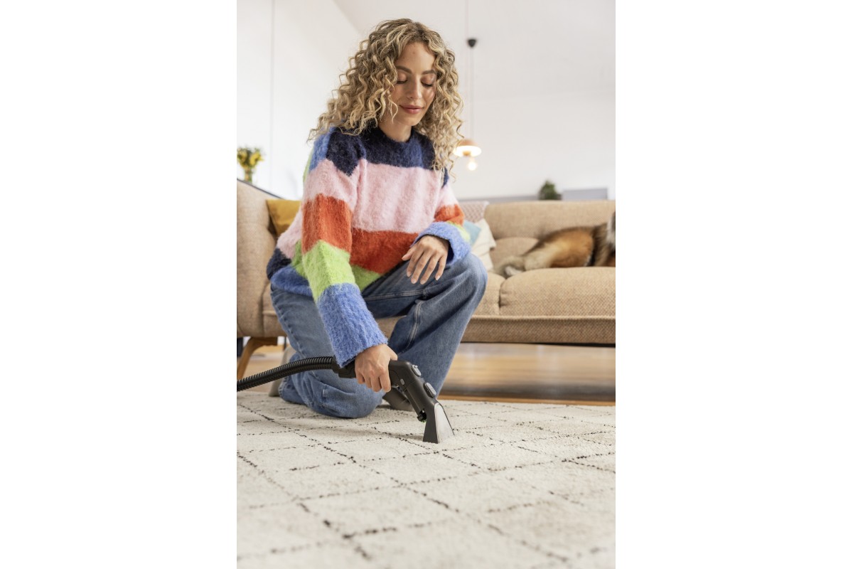 Миючий пилосос Karcher SE 3 Compact Home Floor поєднує компактну конструкцію з потужною та енергоефективною технологією, забезпечуючи глибоке очищення текстильних поверхонь, таких як оббивка м’яких меблів та килими. Завдяки компактним розмірам він займає мінімум місця зберігання і швидко готовий до використання. Пристрій ефективно видаляє бруд, а гнучкий шланг, що всмоктує, і довгий кабель гарантують маневреність і комфорт. Інноваційна насадка «2 в 1» з подовжувальними трубками дозволяє очищати килими, зберігаючи вертикальну позу тіла, а елементи управління на рукоятці прискорюють процес очищення м’яких меблів. Система баків «2 в 1» мінімізує контакт із брудом, а функція промивання після роботи підтримує гігієну, запобігаючи розмноженню бактерій та появі неприємних запахів. Комплект включає мийну насадку для м’яких меблів, щілинну насадку і засіб для чищення, а всі аксесуари зручно зберігаються на апараті, завжди під рукою.