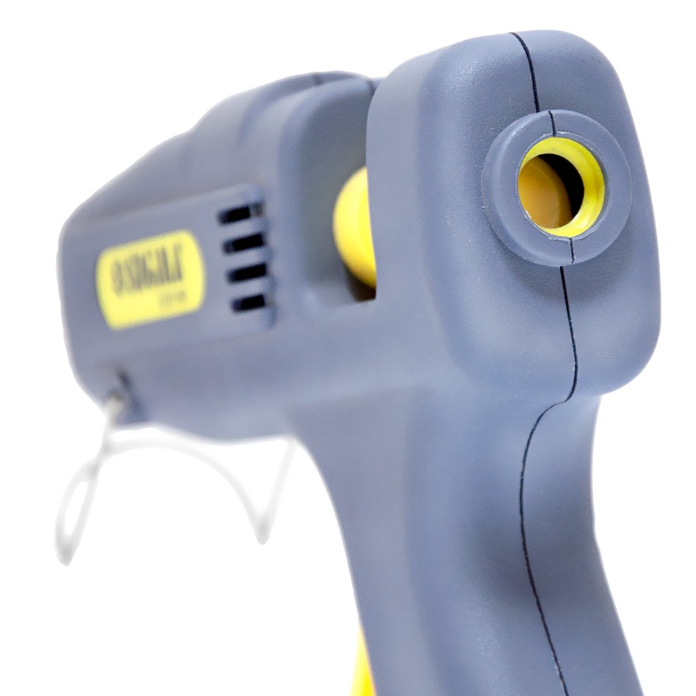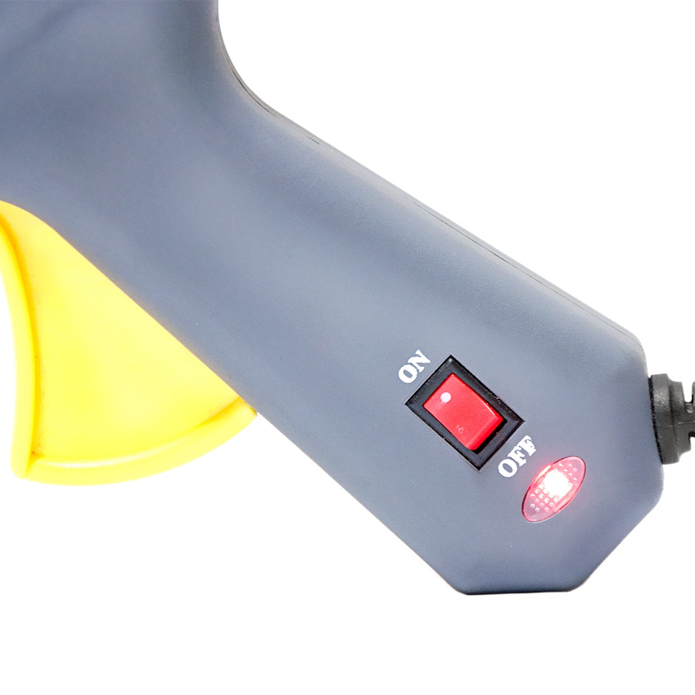Перед початком роботи вставте клейовий стрижень в отвір, розташований з тильного боку пістолета. Підключіть обладнання до мережі, переконайтеся, що індикатор на ручці загорівся. Після цього поставте пістолет на підставку та зачекайте 5-8 хвилин. Далі, натискаючи на курок, подавайте клейовий стрижень уперед до витікання клею з носика. Після завершення роботи вимкніть прилад з мережі та зачекайте 5-8 хвилин, поки він охолоне.