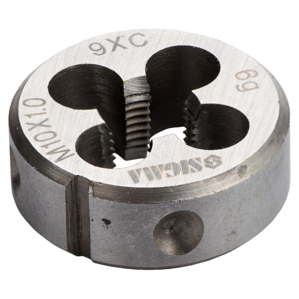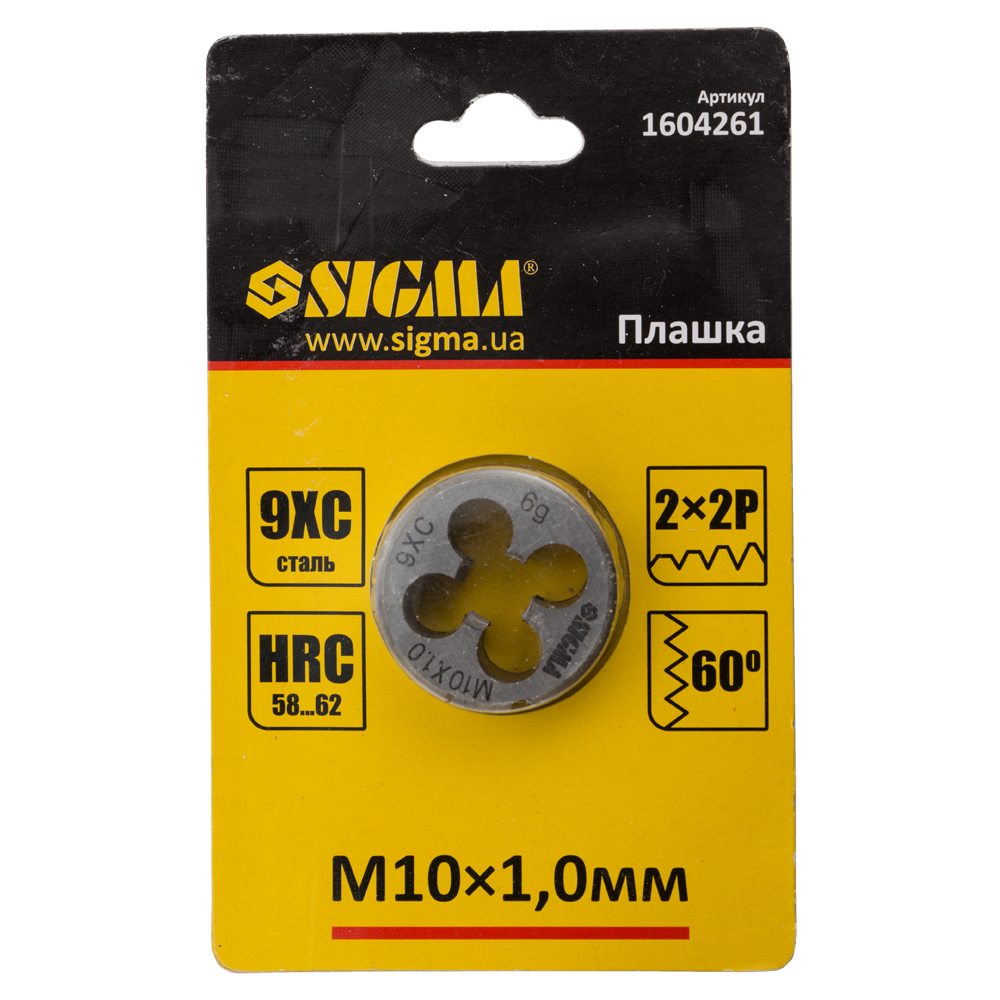 Плашка М10×1,0мм Sigma 1604261 призначена для нарізування або калібрування зовнішніх різьблень. Для роботи закріплюються у тримачах для плашок зі стопорними гвинтами. Для фіксації на зовнішньому циліндрі плашки існують конічні заглиблення та кутовий паз. При нарізанні, різьблення, попередньо змащують консистентним мастилом.