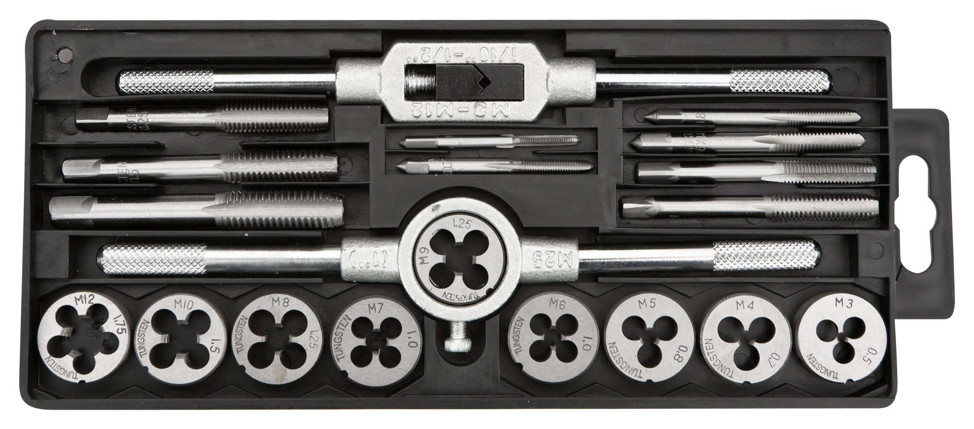 Плашки та мітчики TOPEX, набір 20шт, M3-M12, крок різьблення 0.5-1.75мм, вольфрамова сталь (14A425)