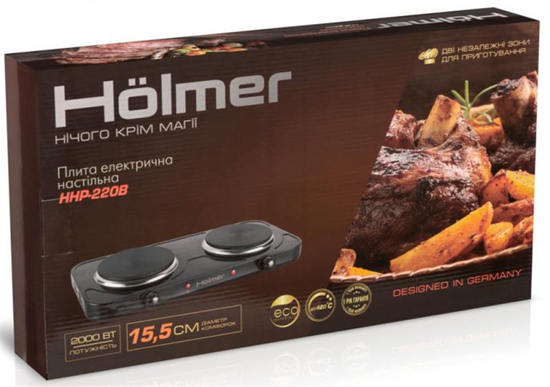 Потужна, компактна і зручна - це настільна електроплита Holmer HHP-220B. Дана модель виконана в класичному білому кольорі, з двома чавунними конфорками. Має функцію захисту від перегріву, механічний регулятор температури (5 режимів) і загальну споживану потужність 2000 Вт. Плита HHP-220B - відмінний варіант для невеликого кухонного простору.