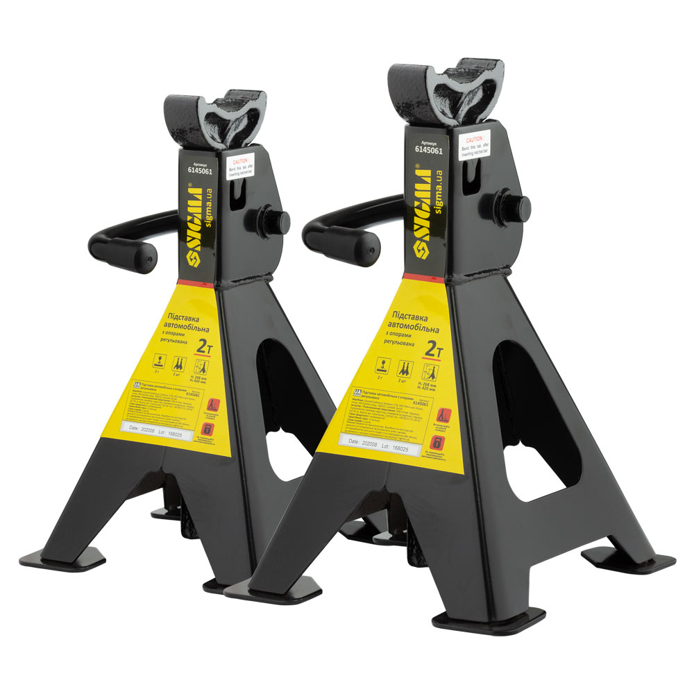 Підставка автомобільна з опорами регульована 2т (2шт) Sigma (6145061) - професійний засіб надійної фіксації та страховки під час підйому автомобіля для проведення огляду та ремонтних робіт. Рекомендується використовувати з усіма типами домкратів. Потужна рама із цільного сталевого листа з мінімумом зварних швів – гарантує безпеку робіт. Універсальний діапазон висот фіксації (від 278 до 420мм) дозволяє обслуговувати автомобілі з різним кліренсом. Збільшені опори ніжок забезпечують надійну (без перекосів) фіксацію підставки на поверхні та захищають від пошкоджень покриття для підлоги в гаражах і автосервісах.