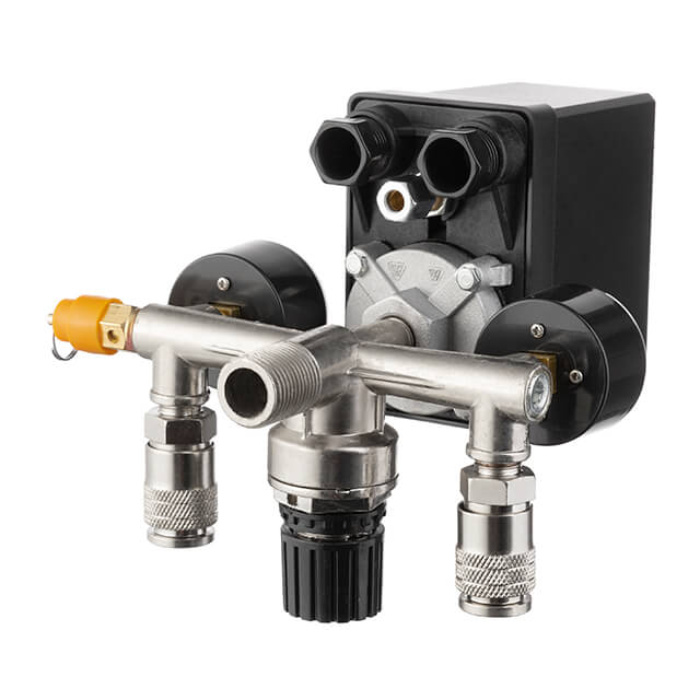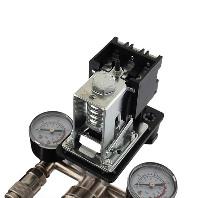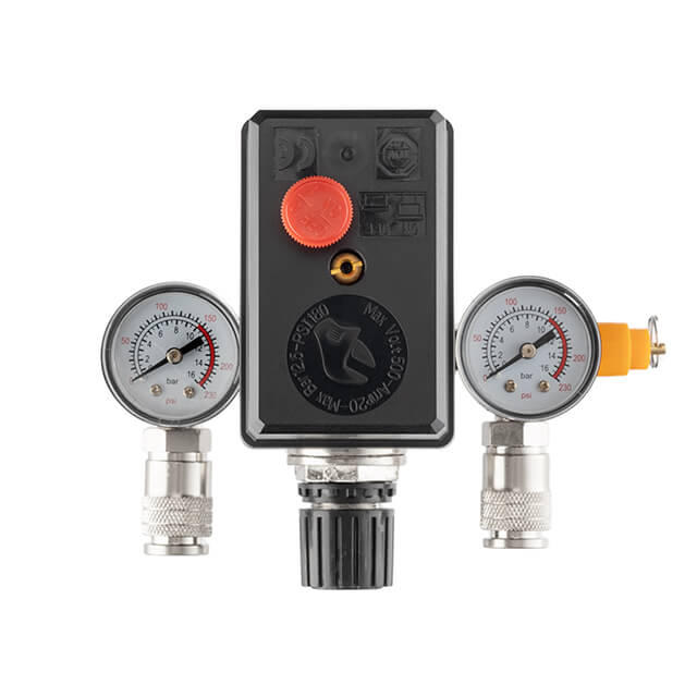 Пресостат в зборі, або реле тиску (блок керування), призначений для контролю тиску в ресивері компресора за заданими параметрами в автоматичному режимі. Використовується для однофазних повітряних поршневих компресорів з напругою 380 В, максимальною потужністю до 3 кВт.