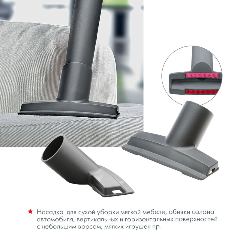 Пилосос відмінно справляється також з сухим і вологим прибиранням килимів і м"яких меблів. Він промиває килими до основи ворсу, знищує бруд і плями і надає текстильним поверхням свіжому, оновленому вигляду.