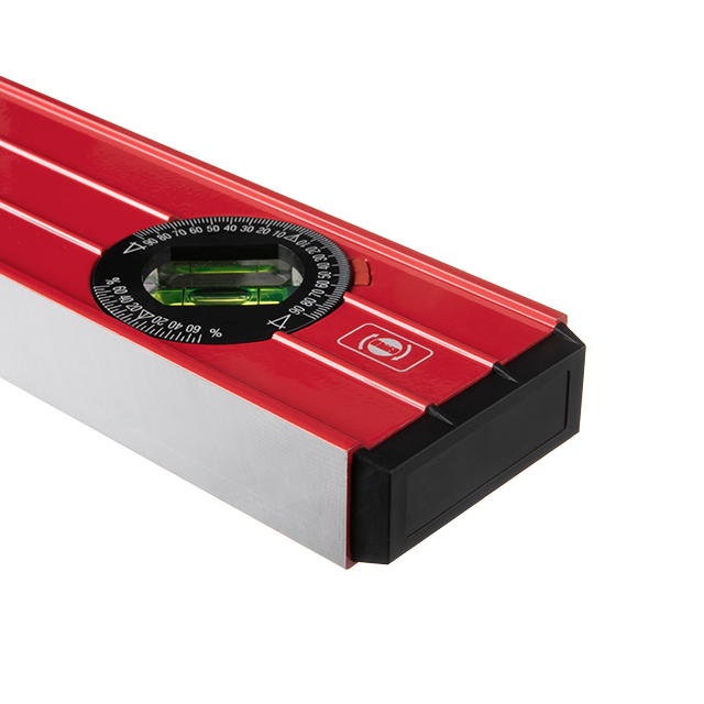 Корпус рівня виготовлений з міцного литого алюмінію з анодуванням, що гарантує зносостійкість та довговічність виробу. Ребра жорсткості підсилюють конструкцію та роблять рівень стійким до механічних пошкоджень. Фрезерування однієї сторони рівня забезпечує максимально щільне прилягання до поверхні, що полегшує роботу майстра.