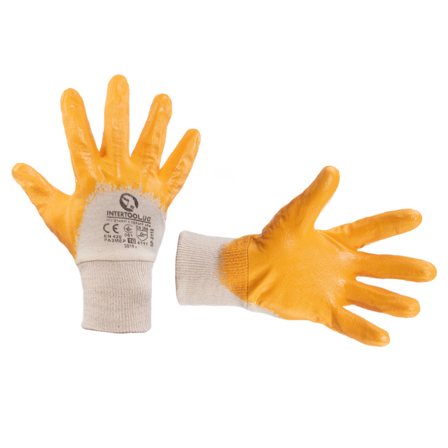 3/4 долоні рукавиць вкриті жовтим щільним нітрилом для більш стійкого захисту рук від забруднень і механічних пошкоджень. При цьому рукавиці досить гнучкі. Мають в'язаний манжет для фіксації на зап'ясті.