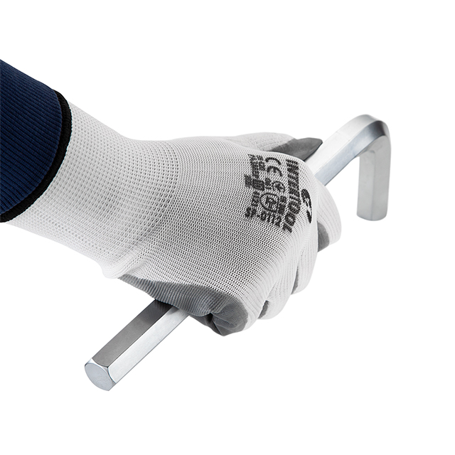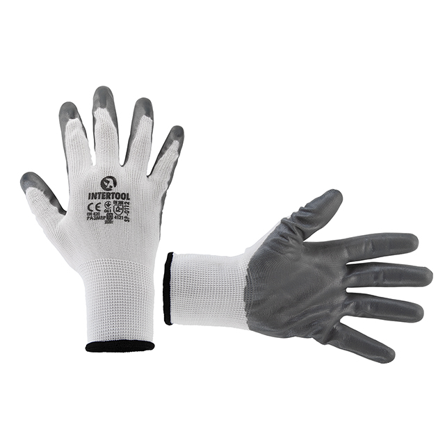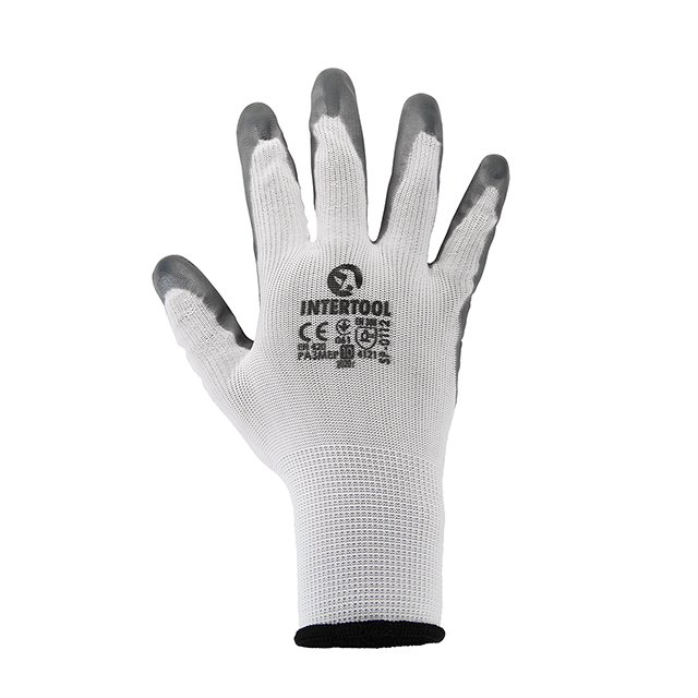 Долоні рукавиць вкриті сірим нітрилом для стійкого захисту рук від забруднень і механічних пошкоджень. При цьому рукавиці не сковують рухів пальців. Мають в'язаний манжет для фіксації на зап'ясті проти потрапляння всередину пилу і дрібних частинок.
