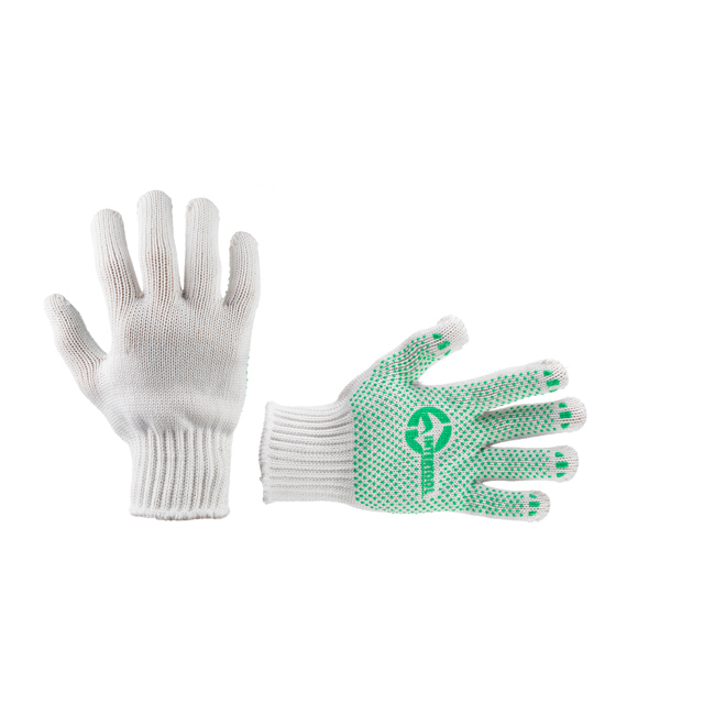 Рукавички б/п INTERTOOL SP-0133 трикотажні білого кольору. На долоні нанесене зелене ПВХ-покриття, що забезпечує захист рук і надійний захват предметів. З еластичними манжетами, які м'яко прилягають до кисті і запобігають потраплянню побутового і будівельного сміття всередину рукавичок. Завдяки бавовняній основі забезпечується вільний повітрообмін. Призначені для виконання будівельних і сільськогосподарських робіт, ручних механоскладальних робіт.