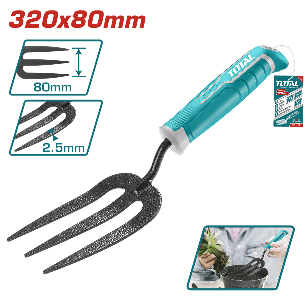 Вилка садова TOTAL THFTF38 використовується для викопування розсади при пересадці рослин, без ризику пошкодити коріння. Ергономічна ручка з еластичним покриттям. Довжина - 320 мм, ширина - 80 мм, товщина металу - 2.5 мм. Матеріал робочої частини - вуглецева сталь.