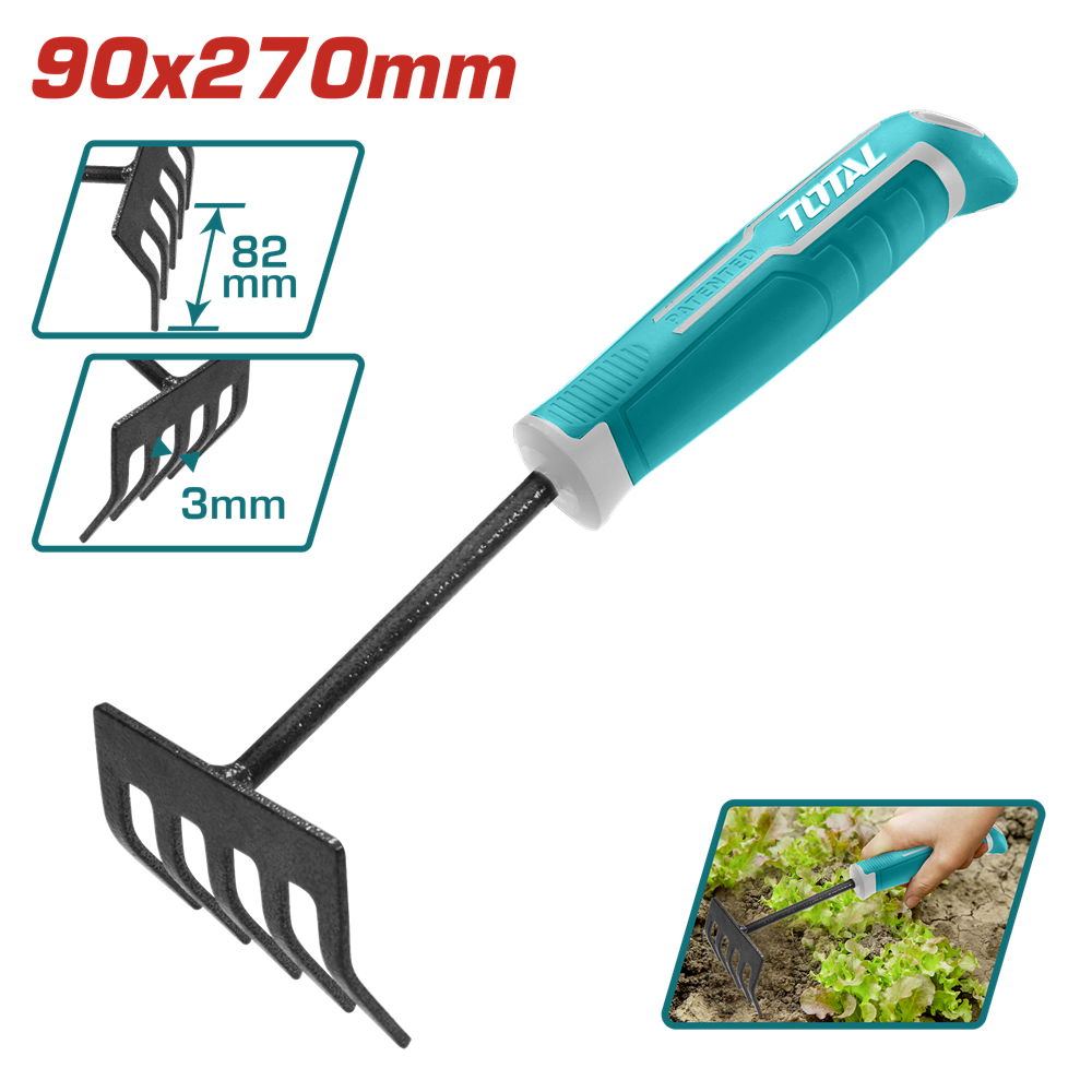 Грабельки садові TOTAL THFTR1008 застосовуються для садових робіт у важкодоступних місцях, наприклад між рослинами або під кущами. Ергономічна ручка з еластичним покриттям. Довжина - 270 мм, ширина - 82 мм, товщина металу - 3 мм. Матеріал робочої частини - вуглецева сталь.