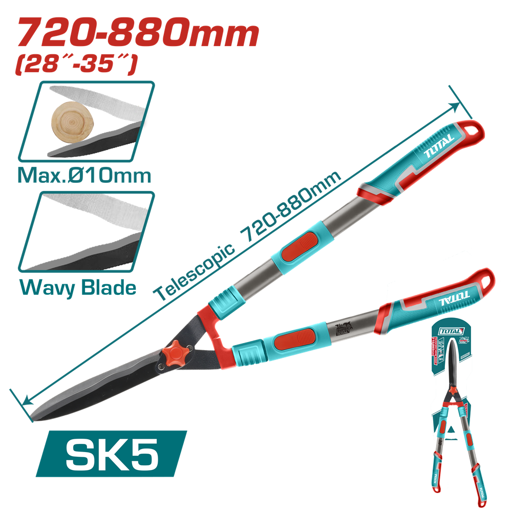 Ножиці садові TOTAL THTS1516306 призначені для обрізки рослин на садово-паркових територіях для надання їм необхідної форми. Подовжені телескопічні ручки (до 880 мм) працюють як важіль і дозволяють обрізати гілки завтовшки до 10 мм. Матеріал лез – вуглецева сталь. Леза покриті тефлоном для захисту від корозії. Рукоятки виготовлені зі сталі, зручно лягають в руці, а завдяки ергономічному гумовому покриттю не ковзають.