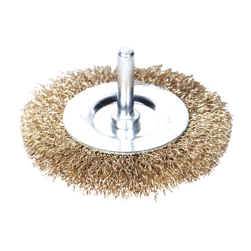 Щітка дротяна дископодібна Ø75мм хвостовик Ø6мм (латунированная) Sigma (9013071) призначена для використання в якості насадки для дриля при зачистці поверхонь від лакофарбових покриттів, іржі, окалини, різних забруднень, зачищення зварних швів.