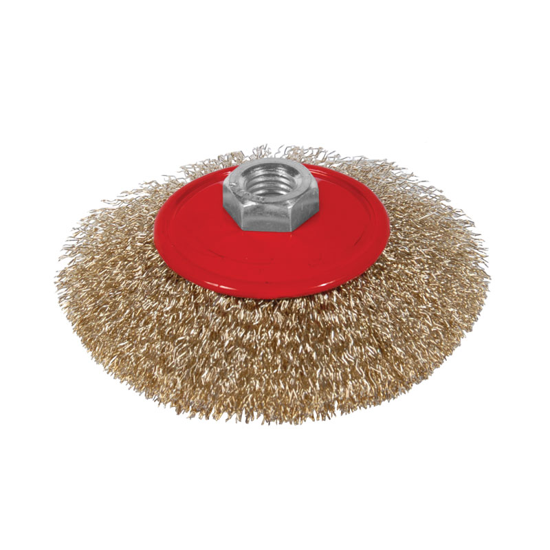 Щітка дротяна конусоподібна Ø115мм М14×2мм (латунированная) Sigma (9016111) призначена для використання як насадка для УШМ при зачистці поверхонь від лакофарбових покриттів, іржі, окалини, різних забруднень, зачищення зварних швів.