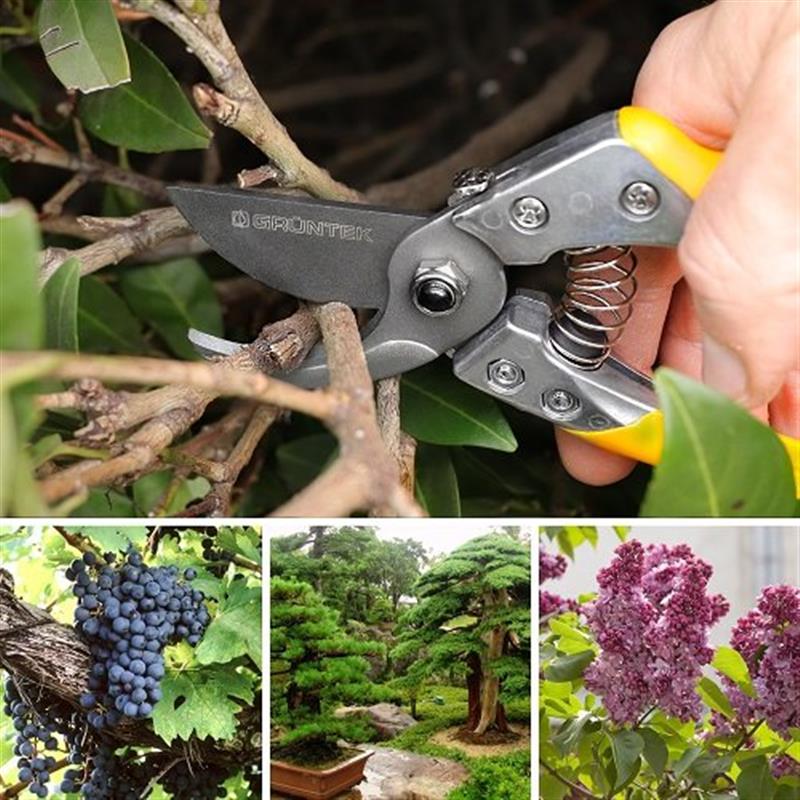 Gruntek Phoenix 200 мм - зручний і надійний секатор призначений для обрізки зелених пагонів, молодих і старих гілок діаметром від 5 до 18 мм. Лезо. Гостро заточені леза секатора виконані із міцної високовуглецевої сталі SK5, яка характеризується великою міцністю та зносостійкістю. Верхнє лезо має спеціальне покриття NON-Stick, яке захищає лезо від пошкоджень та значно зменшує силу тертя леза по деревині, що дозволяє полегшити та прискорити процес обрізання. Покриття NON-Stick оберігає лезо від налипання м'якоті деревини, що забезпечує безперервну роботу секатором. Корпус. Секатор виконаний з алюмінію з хромованим покриттям, а рукоятки мають зручну ергономічну форму та гумові накладки, завдяки яким секатор надійно фіксується в руці та не вислизає під час роботи. Механізм. Якісна пружина Gruntek Phoenix розрахована на 30000 різів, а амортизатори на ручках пом'якшують удари при різанні, роблять різ плавним і знімають напругу і навантаження з рук користувача. до роботи. Секатор Gruntek Phoenix 200 мм - це надійний інструмент для роботи з квітами, кущами, деревами та іншими садовими рослинами.
