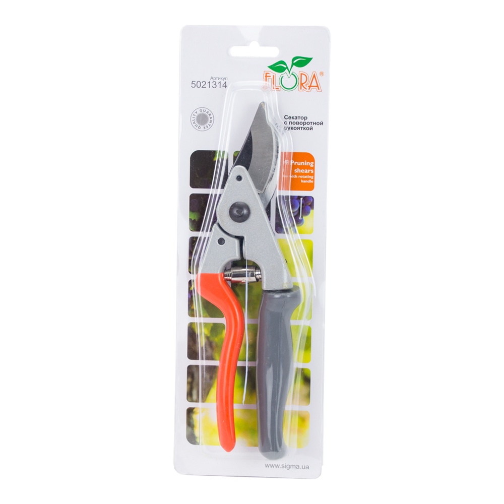 Секатор з поворотною рукояткою 200мм Flora (5021314) призначений для обрізання пагонів та гілок діаметром до 16 мм при формуванні та проріджуванні крони дерев, чагарників, збиранні винограду тощо.