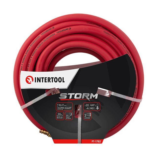 Температура експлуатації від -20 до +60 °С. Міцне армування та товсті стінки забезпечують стабільну роботу шланга з тиском повітря до 20 атм.
