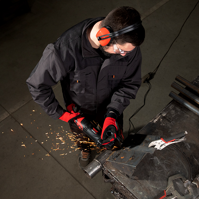 Завдяки поворотній прогумованій рукоятці болгарка дуже комфортно лежить в руці і відмінно підходить для поздовжного шліфування. Міцний металевий захисний кожух встановлюється з будь-якої сторони і захищає вас від сміття, іскор і уламків. Надійний еластичний прогумований дріт не перегинається і не дубіє на морозі.