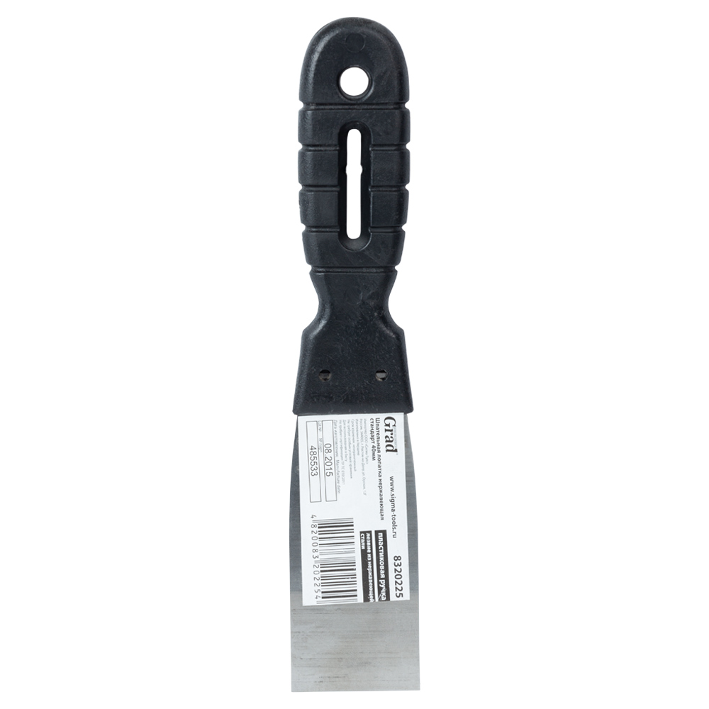 Шпальна лопатка стандарт (нержавіюча) 40мм Grad (8320225) з нержавіючим лезом, яке має змінну товщину для додаткової гнучкості та пружності. Інструмент має пластикову ручку. Шпатель застосовується для штукатурювання зовнішніх і внутрішніх стін, стель для нанесення шпаклівок, мастик і густих клейових сумішей.