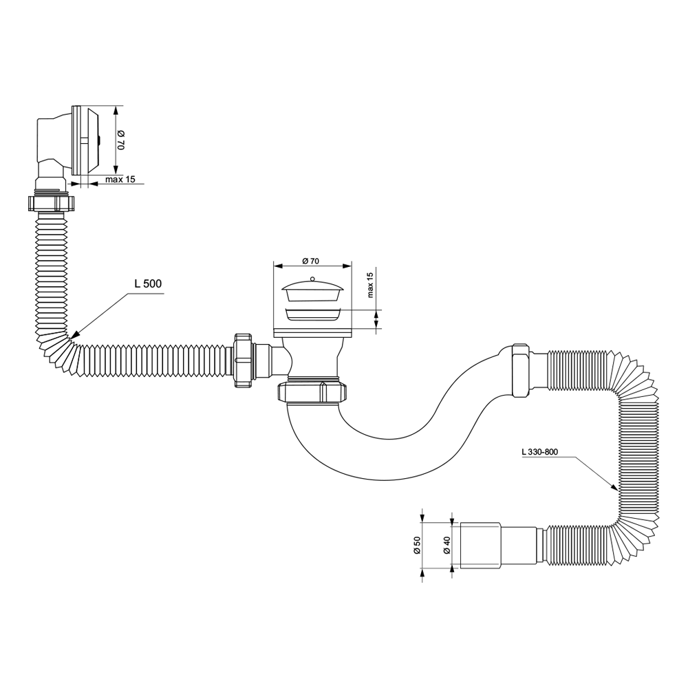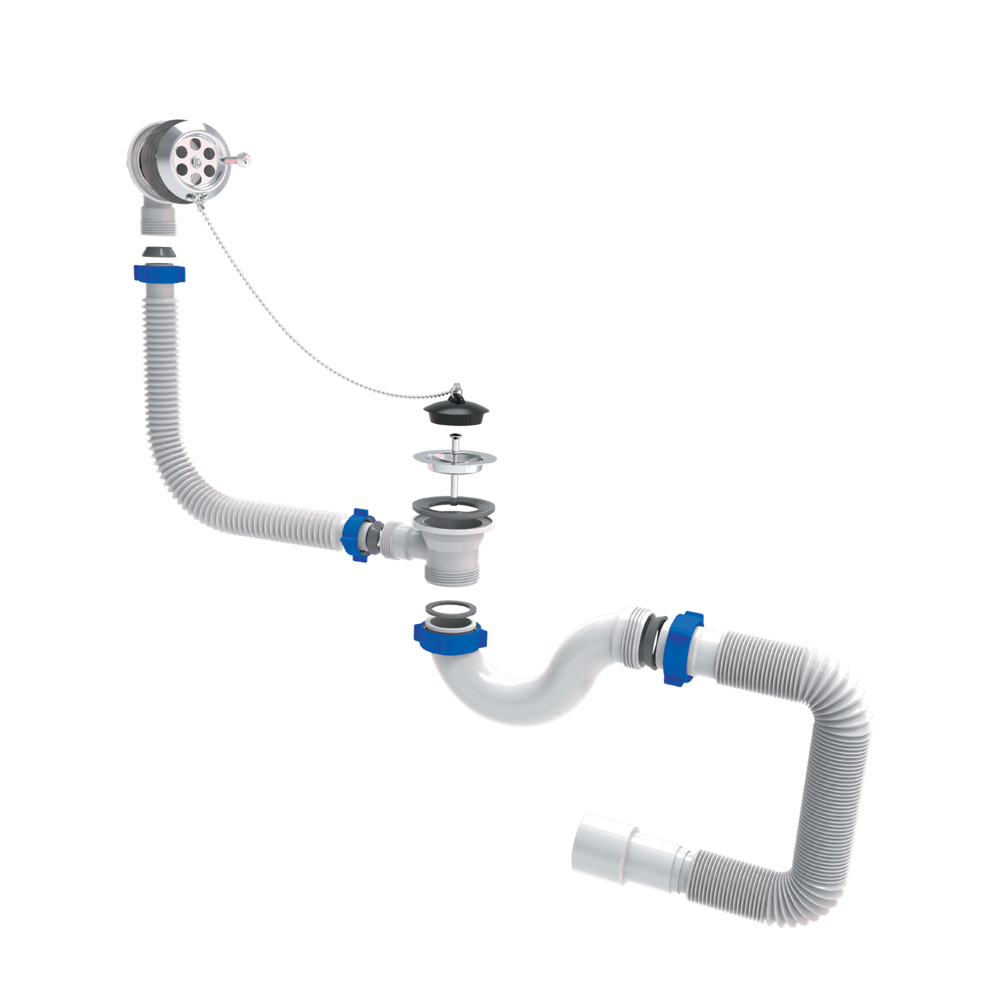 Сифон для ванни прямоточний з пробкою на ланцюжку та гнучким відведенням Ø40/50мм TAU (9843820)