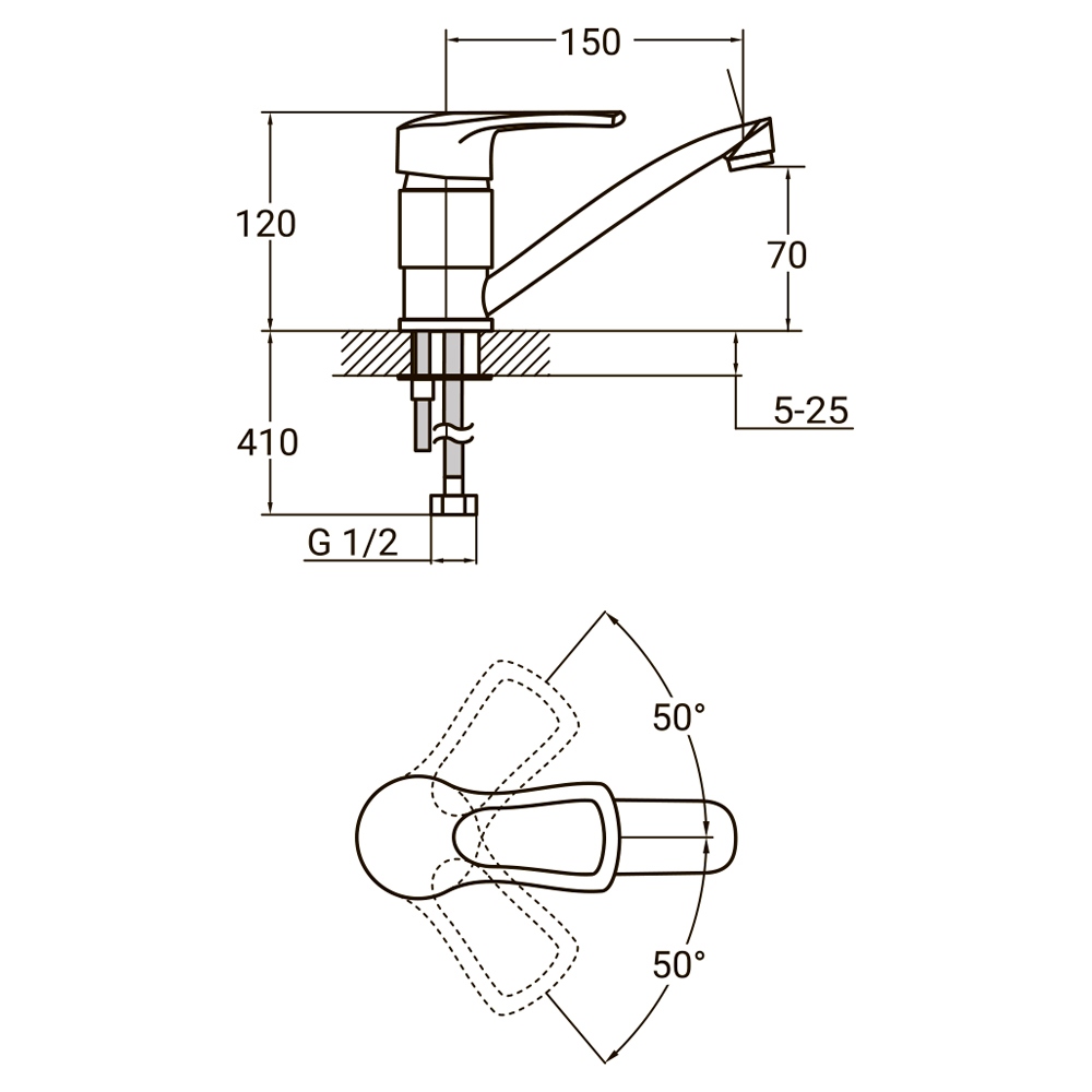Установка змішувача для кухні Акватика виконується на горизонтальну поверхню, основа фіксується шпилькою. Для підключення крана до водопроводу в комплекті є гнучкі підводи.