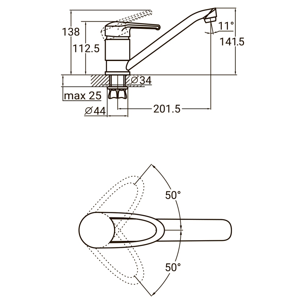 Монтаж змішувача для кухні Акватика виконується на горизонтальній поверхні за допомогою гайки. Підключення до магістралі здійснюється через 2 гнучкі підводи, які додаються в комплекті.