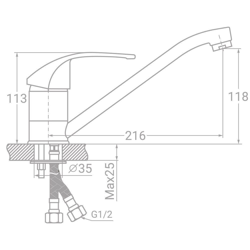 Змішувач встановлюється на виріб урізним способом. У комплекті є 2 гнучкі підводи.