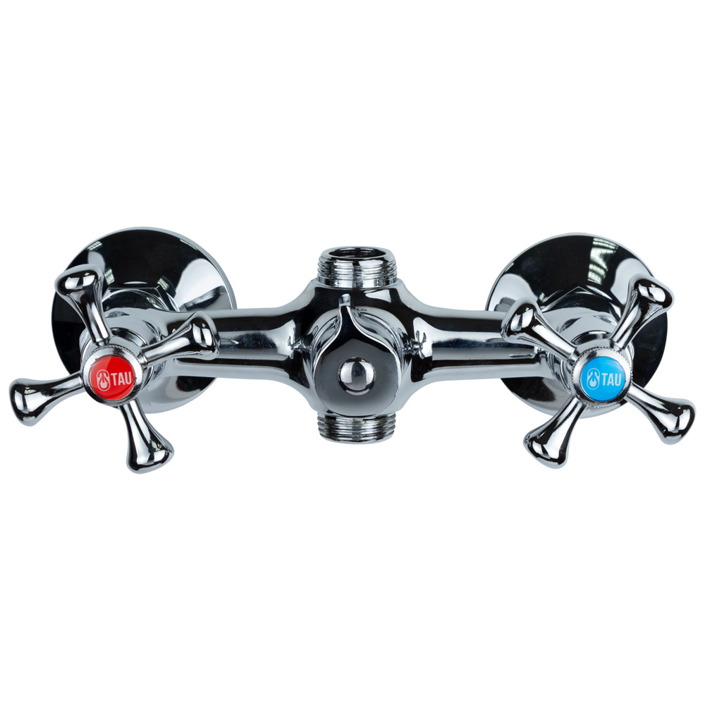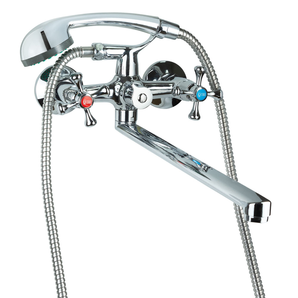Модель TAU VN-2C260C – це двовентильний змішувач для ванної з душем. Класичний дизайн, вентилі гарячої та холодної води – хрестоподібні, декоровані заглушками червоного та синього кольору. Дивертор вбудований, картриджний. Гус прямий, має поворот на 360 °. Вилив має насадку-аератор, яка ефективно розподіляє потік води і перешкоджає попаданню у ванну дрібного сміття. Оскільки цей змішувач для ванної з довгим виливом , його вигідно встановити в санвузлі, в якому відсутня рукомийник.
